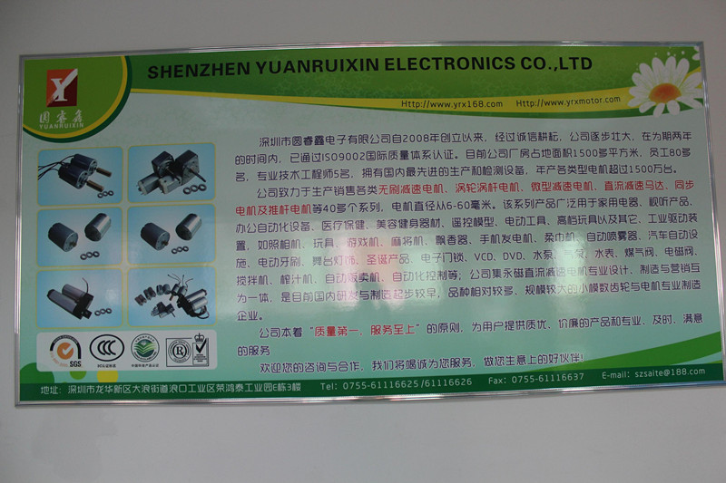 深圳市圓睿鑫電子有限公司自2008年創(chuàng)立以來,經(jīng)過誠(chéng)信耕耘,在為期兩年的時(shí)間內(nèi),已通過ISO9001:2000國(guó)際質(zhì)量體系認(rèn)證。公司廠房占地面積2000多平方米,員工100人,專業(yè)技術(shù)工程師6名,擁有國(guó)內(nèi)最先進(jìn)的生產(chǎn)和檢測(cè)設(shè)備,年產(chǎn)各類減速電機(jī)超過2~300萬臺(tái)。因公司發(fā)展需要,于2020年底,將生產(chǎn)基地遷往擁有最美小鎮(zhèn)之稱的東莞市清溪鎮(zhèn),依山傍水,依托美麗的大自然環(huán)境和地方文化,全新的東莞市圓睿鑫電子有限公司將借助深圳母公司平臺(tái),一步步走上新的臺(tái)階。 東莞公司將繼續(xù)致力于生產(chǎn)銷售各類無刷減速電機(jī) 渦輪渦桿電機(jī),微型減速電機(jī),直流減速馬達(dá),交流手搖發(fā)電機(jī)、同步電機(jī)及空心杯電機(jī)等,電機(jī)直徑從6-60毫米為定位,系列產(chǎn)品廣泛用于智能家電、智能辦公自動(dòng)化設(shè)備、智能醫(yī)療、美容健身器材、遙控模型、電動(dòng)工具、高檔玩具以及其它工業(yè)驅(qū)動(dòng)裝置,如高檔玩具、游戲機(jī)、麻將機(jī)、飄香器、手機(jī)發(fā)電機(jī)、柔巾機(jī)、自動(dòng)噴霧器、汽車自動(dòng)設(shè)施、電動(dòng)牙刷、舞臺(tái)燈飾、圣誕產(chǎn)品、智能電子門鎖、VCD、DVD、水泵、氣泵、水表、煤氣閥、電磁閥、攪拌機(jī)、榨汁...